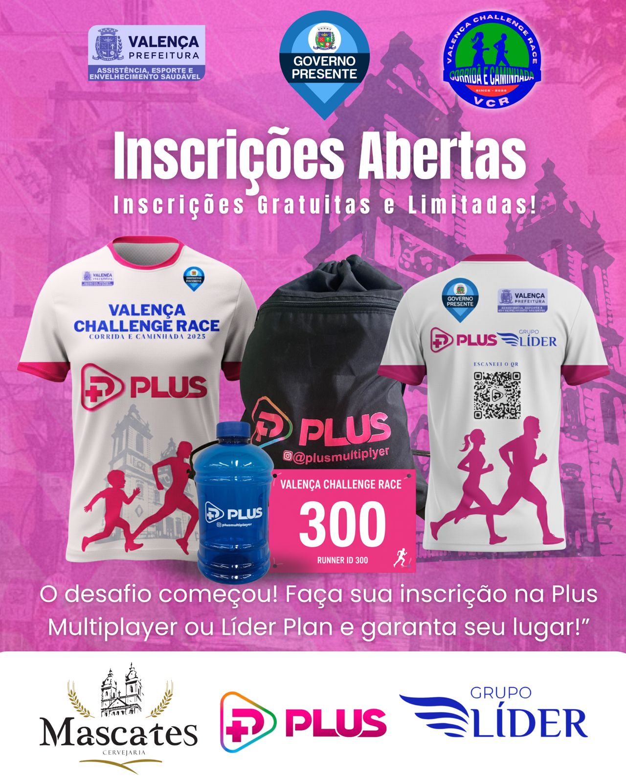 🏃♀️ VALENÇA CHALLENGE RACE 2025 🏃♂️A VCR é uma corrida do Programa Governo Presente, organizada pela Secretaria Municipal de Assistência Social, Esporte e Envelhecimento Saudável, com o apoio e parceria de empresários locais:🤝 Grupo Líder Plan🤝 Plus Multiplayer🍻 Cervejaria MascatesUm grande evento que une esporte, saúde e integração, fortalecendo o espírito esportivo e o compromisso com uma Valença mais ativa e saudável! 💪🎽 INSCRIÇÕES ABERTAS – VALENÇA CHALLENGE RACE 2025!A partir desta segunda-feira, dia 10 de novembro, estão abertas as inscrições para a 1ª Valença Challenge Race, corrida e caminhada!As inscrições são presenciais e podem ser realizadas em nossos pontos parceiros:📍 Plus MultiplayerRua Dr. Figueiredo, 333 – Loja B➡️ Em frente à Prefeitura Municipal📍 Grupo Líder PlanRua Comendador Araújo Leite, nº 347 – Centro➡️ Antiga rua do SENAIAo realizar sua inscrição, você preencherá o protocolo e receberá o parquet, que deverá ser entregue no momento da retirada do kit, no dia da prova.📅 Data da corrida: 23 de novembro🕕 Retirada dos kits: das 6h30 às 7h30, no Jardim de CimaEntão, você que quer garantir sua vaga, já pode se dirigir a um dos nossos parceiros e fazer sua inscrição!