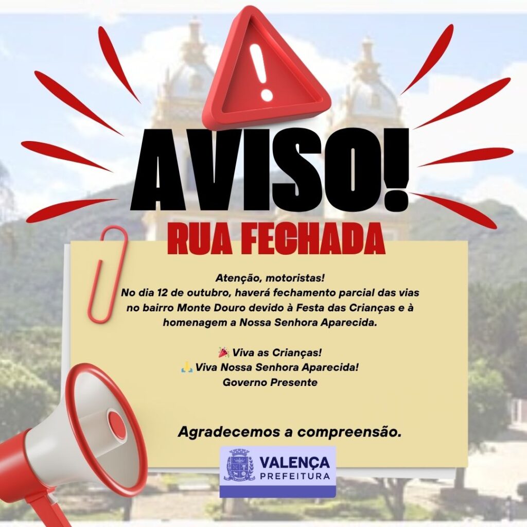A Prefeitura de Valença, por meio da Secretaria Municipal de Ordem Pública, Defesa Civil e Transporte (SEOP), informa que neste domingo, 12 de outubro, haverá fechamento parcial de vias no Bairro Monte D’Ouro para a realização da Festa das Crianças e da Procissão de Nossa Senhora Aparecida.