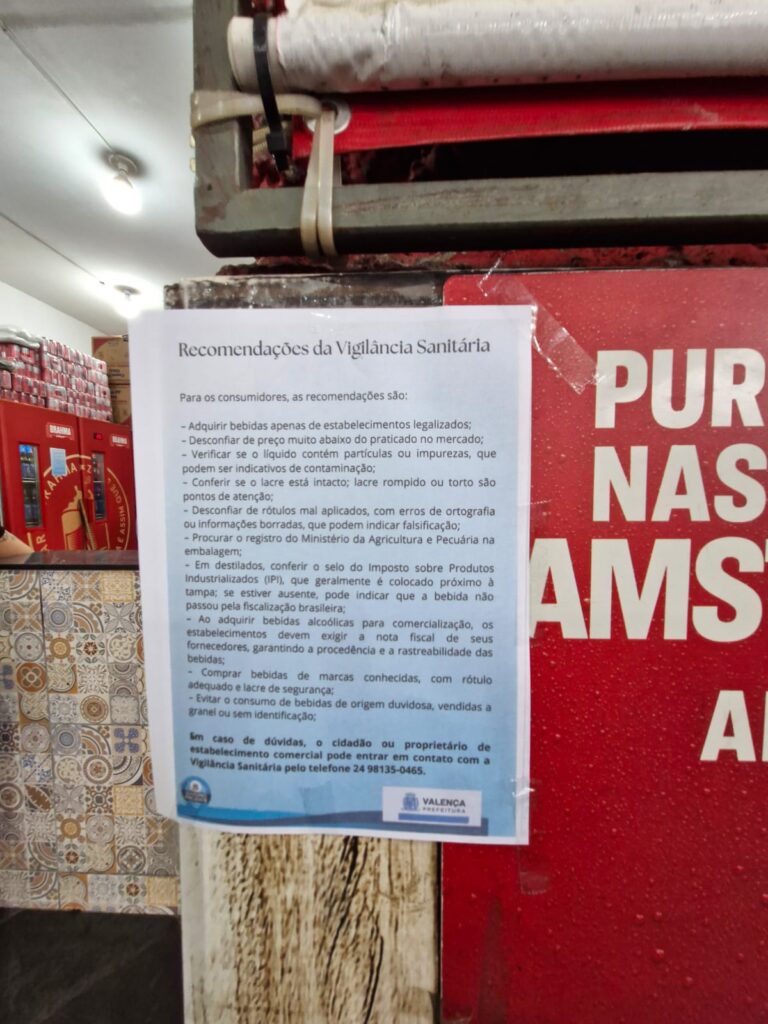 A Secretaria Municipal de Saúde, por meio da equipe de Vigilância em Saúde, realizou na quarta-feira, dia 8 de outubro, uma ampla ação de fiscalização em diversos estabelecimentos comerciais de Valença que vendem bebidas alcoólicas. A iniciativa teve como principal objetivo prevenir a comercialização de produtos adulterados com metanol, substância tóxica que tem causado preocupação em todo o país devido a casos recentes de intoxicação e mortes.