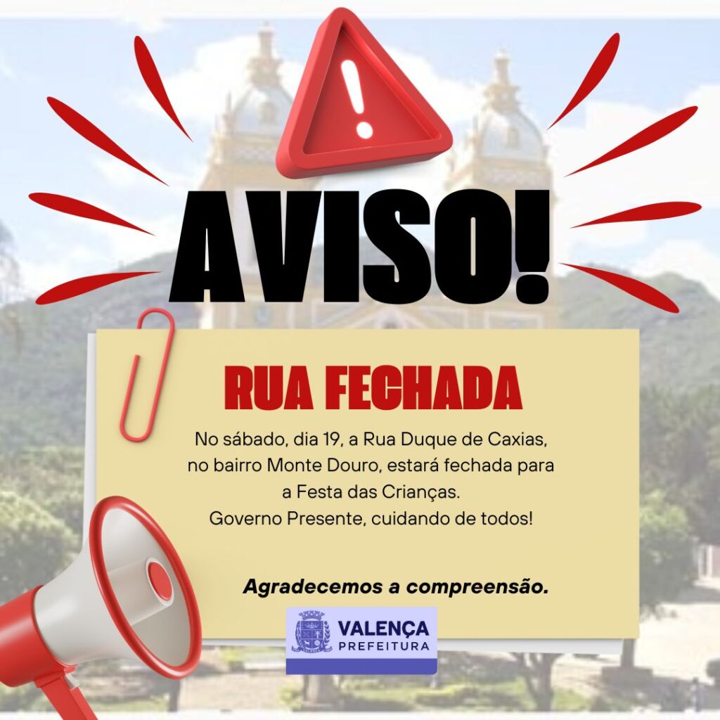 A Prefeitura de Valença / Governo Presente, por meio do Departamento de Trânsito, Tráfego e Ronda Escolar, autorizou o fechamento parcial da Rua Duque de Caxias, no Bairro Monte D’ouro, no dia 19 de outubro de 2025, das 12h às 18h, para a realização da festa comemorativa do Dia das Crianças.