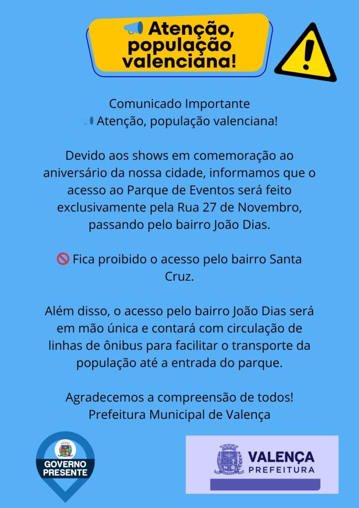 A Prefeitura de Valença / Governo Presente informa à população sobre as alterações no trânsito para os shows em comemoração ao aniversário da cidade. O acesso ao Parque de Eventos será realizado exclusivamente pela Rua 27 de Novembro, passando pelo bairro João Dias.