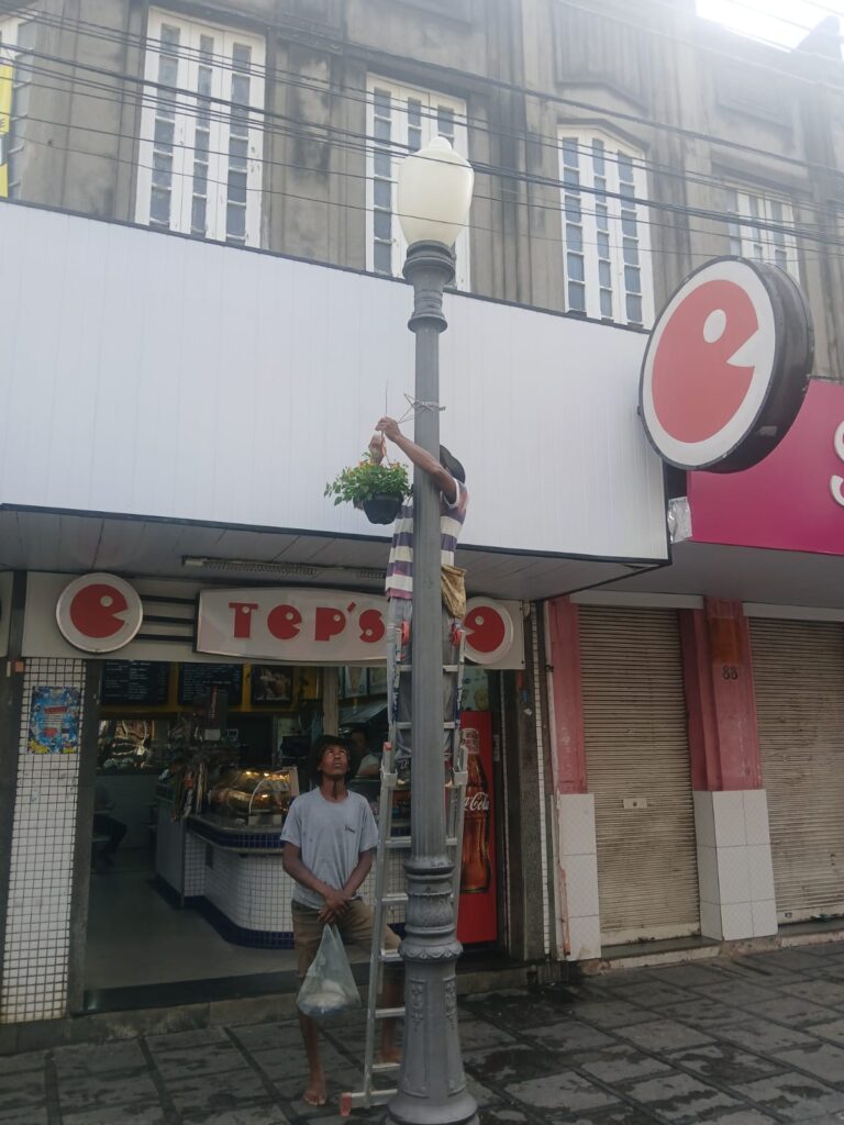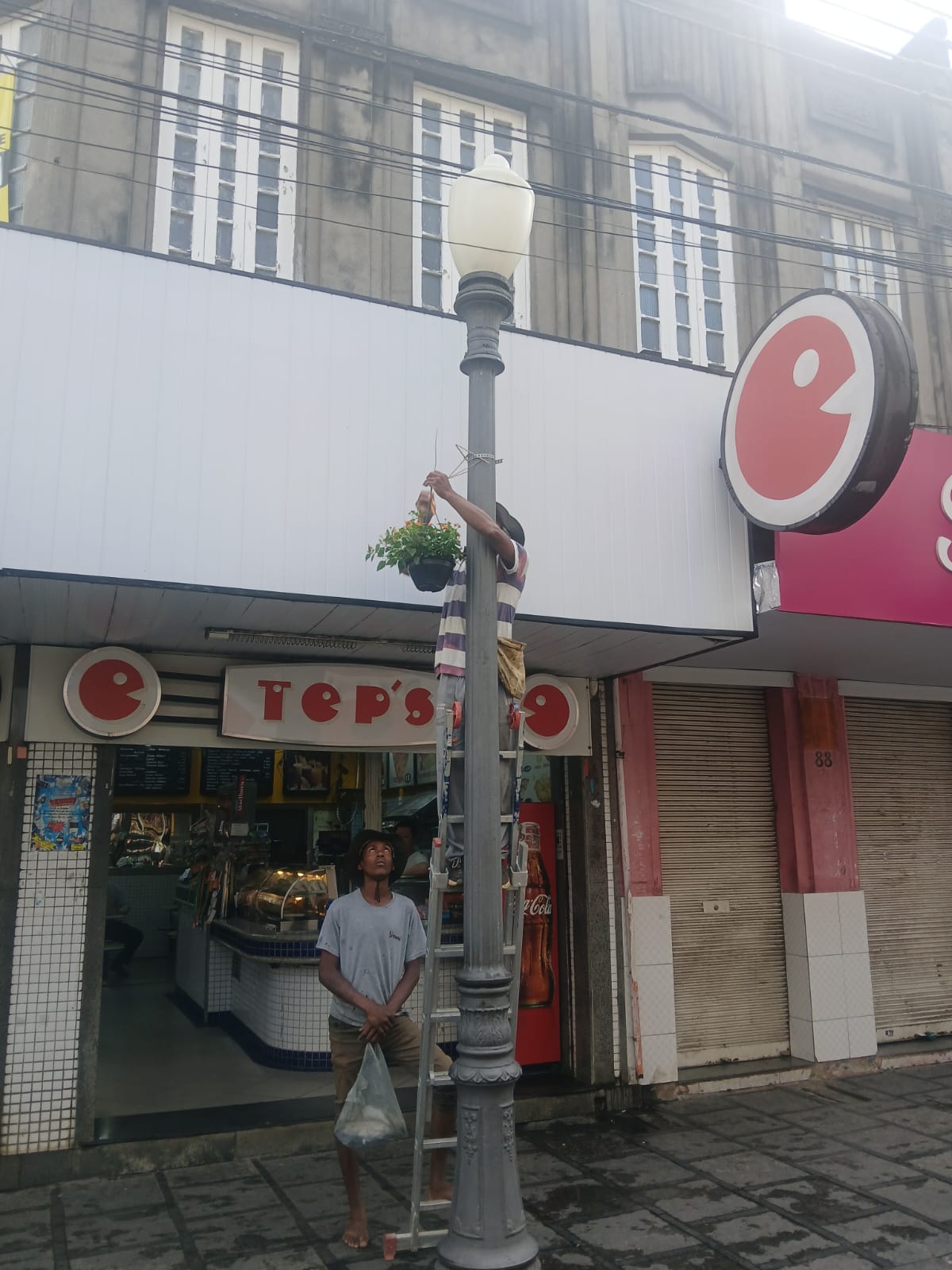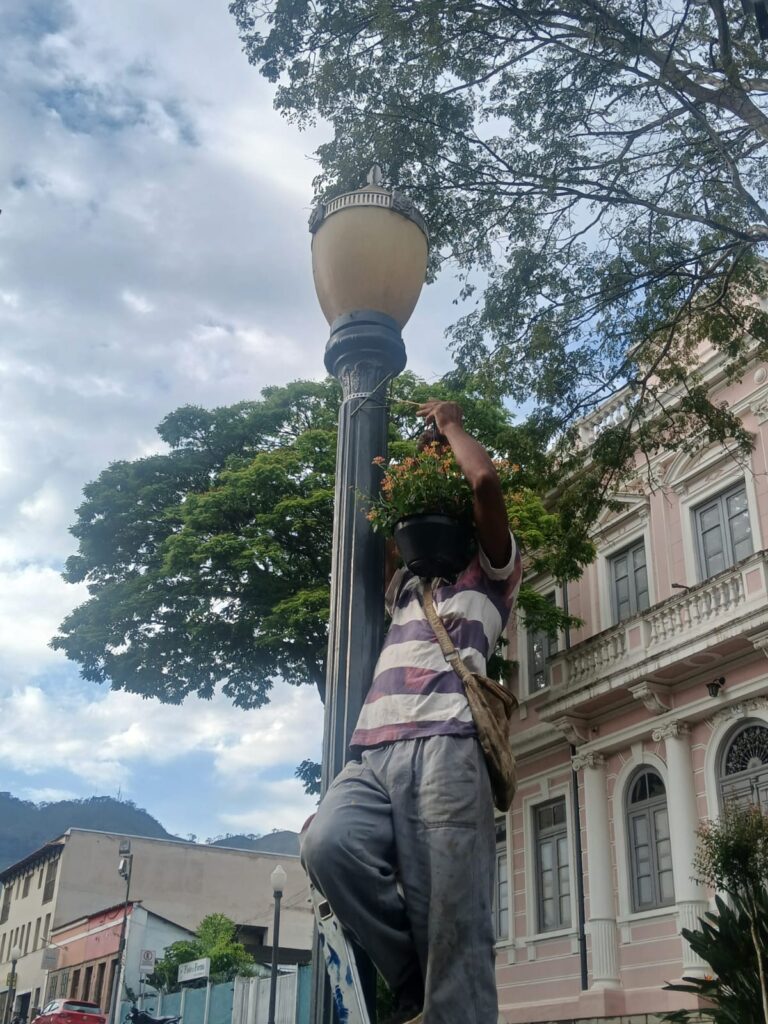 Nesta semana, o trabalho de embelezamento chegou à Rua dos Mineiros, tradicional via de pedestres no Centro, além da ladeira da Catedral, que receberam ornamentos floridos em postes.
