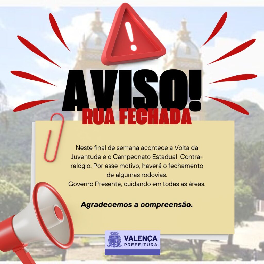 A Prefeitura de Valença / Governo Presente, por meio da Secretaria Municipal de Ordem Pública, Defesa Civil e Transporte (SMOP), informa que haverá fechamento parcial das rodovias RJ-145 e RJ-151 nos dias 11 e 12 de outubro de 2025, em razão da realização da Volta da Juventude e do Campeonato Estadual de Contra Relógio.
