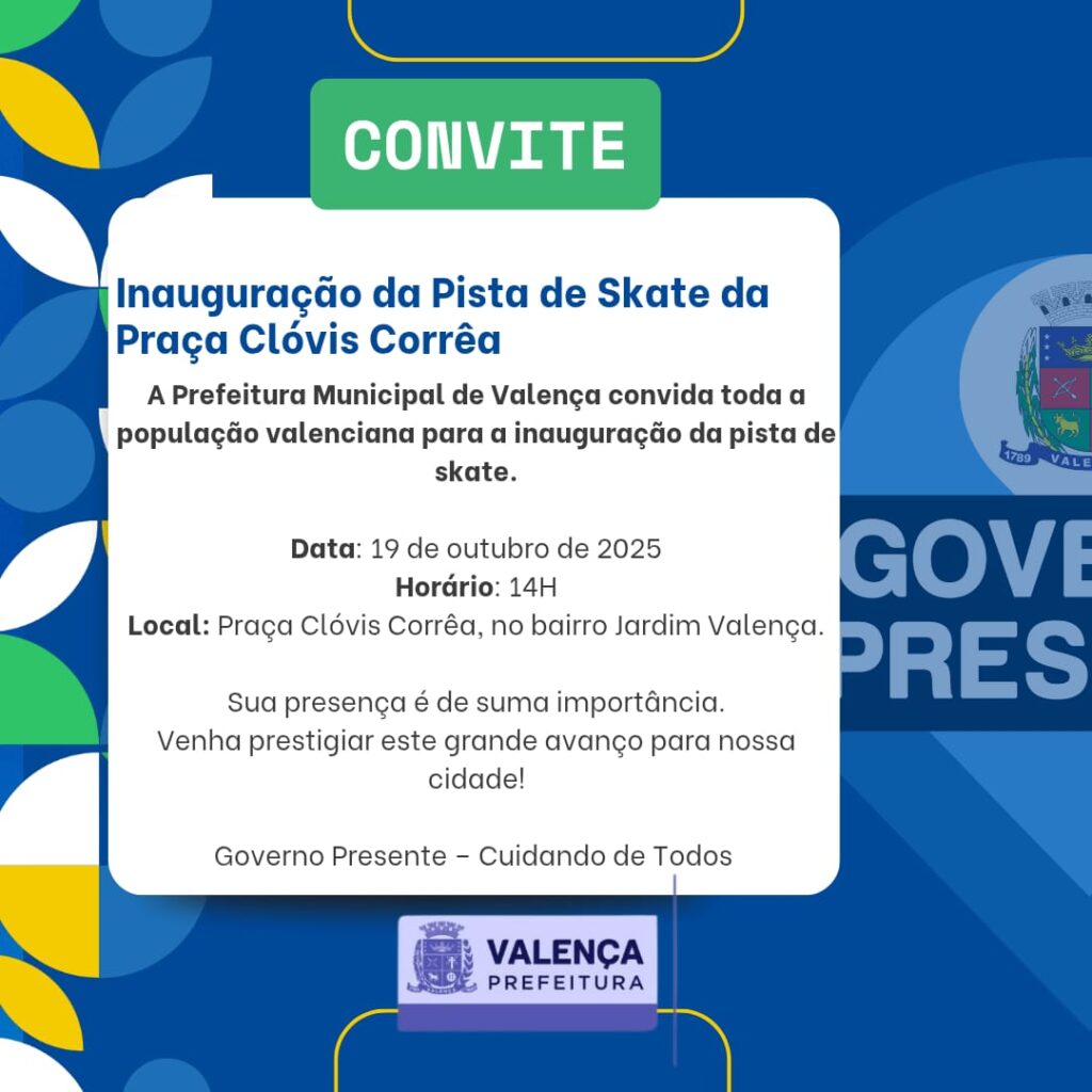 A Prefeitura de Valença / Governo Presente convida toda a população para a inauguração da nova pista de skate da Praça Clóvis Corrêa, no bairro Jardim Valença, neste domingo, 19 de outubro de 2025, às 14h.