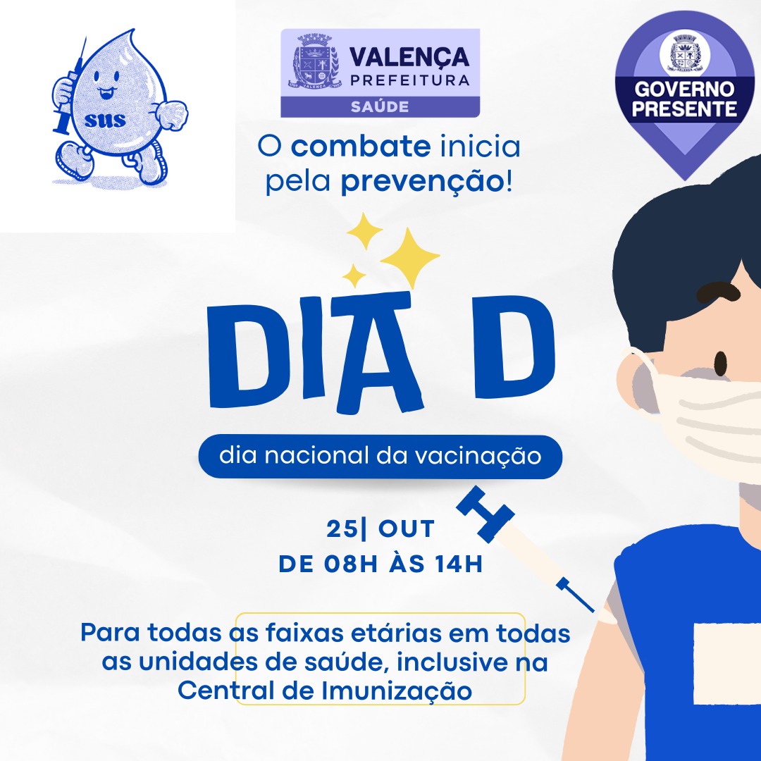 A Secretaria Municipal de Saúde de Valença realiza no próximo sábado, dia 25 de outubro, o Dia D de Vacinação, com atendimento das 8h às 14h em todas as unidades de saúde do município. A ação tem como objetivo ampliar a cobertura vacinal e garantir a atualização das cadernetas de vacinação de crianças, adolescentes e adultos.